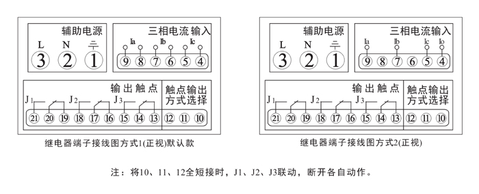 , 無數(shù)值顯示。繼電器達(dá)到所設(shè)定值,動作后,由TIRP動作燈會點亮,實際線路電流低于或高于所設(shè)定的返回值,指示燈切換回來。正常運行情況下,RUN運行燈、電流設(shè)置表示燈常亮。L1、L2、L3來回切換運行。當(dāng)輸入電流任意一相滿足動作條件,繼電器動作,電流標(biāo)識燈熄滅,表示延時時間已到動作。當(dāng)輸入接近動作條件時,繼電器進(jìn)入動作預(yù)備狀態(tài),所有芯片資源用來計算輸入值,一旦滿足條件,立即啟動計時,繼電器設(shè)有啟動量連續(xù)判斷功能和突變量連續(xù)判斷功能,能夠有效迅速的判斷輸入值,并躲過短時干擾。HJL-93AF三相過電流繼電器接線圖